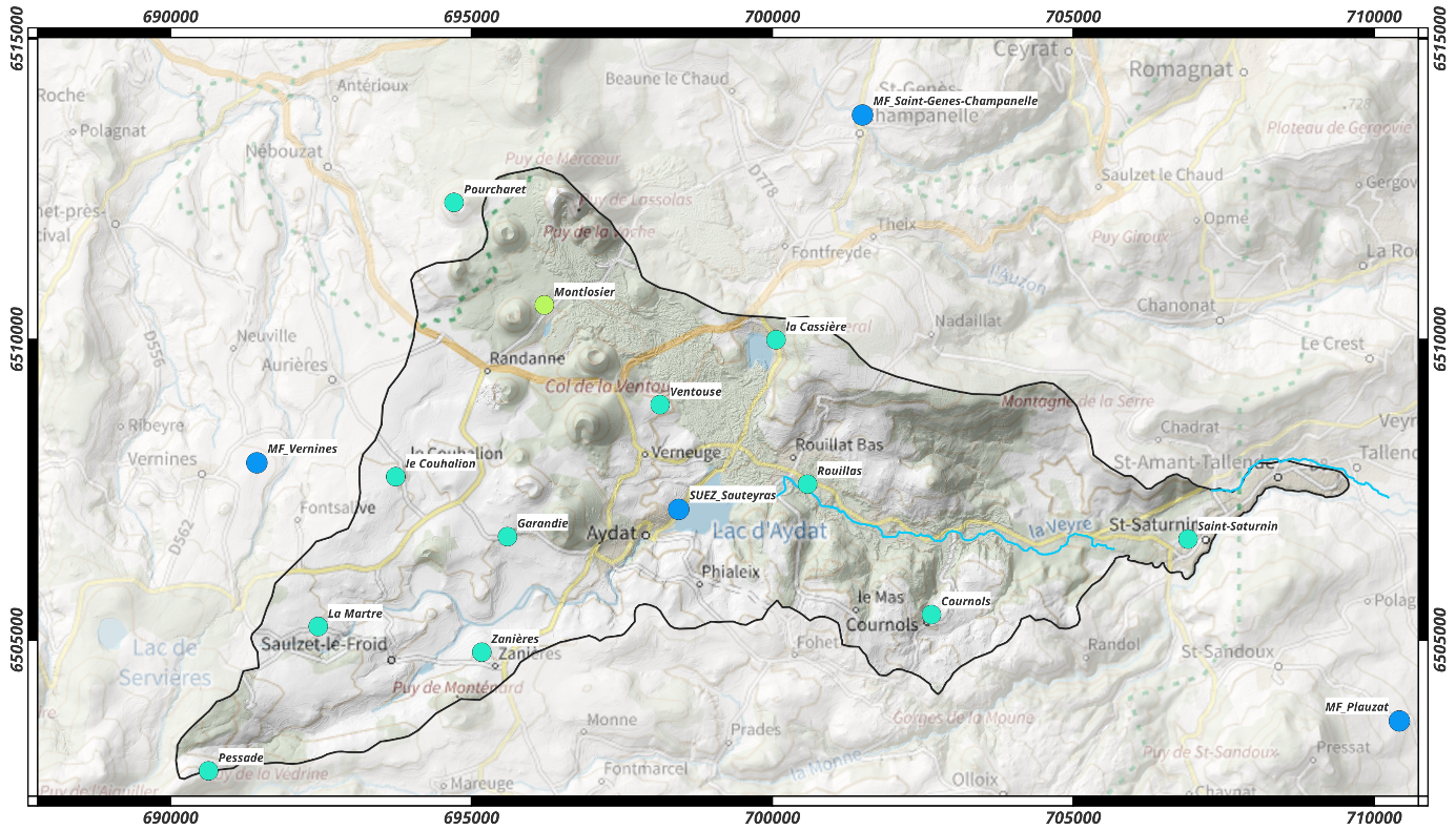 La caractérisation spatialisée des précipitations va permettre d’améliorer la compréhension de l’hydrologie du bassin versant qui alimente le lac d’Aydat ainsi que les processus de recharge des aquifères volcaniques de la cheire de la Veyre. En complément des pluviomètres et des instruments déjà en place autour du lac d’Aydat (AyData), d’autres capteurs (AqueTROLL) vont être déployés dans un futur proche afin de suivre plusieurs cours d’eau sur le bassin versant. Ces installations utiliseront également des nœuds Solo et les passerelles existantes.